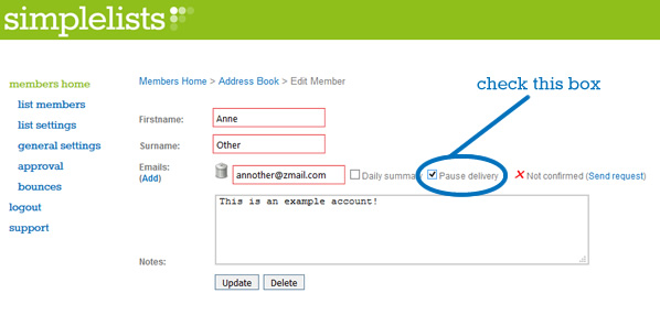 Login to your Simplelists account, navigate to 'list members’, select a member from the address book and tick the 'pause delivery’ check-box. To restart delivery simply uncheck the box.