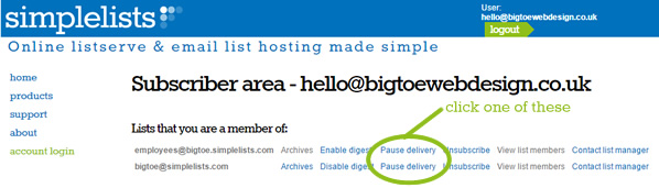 Visit http://archives.simplelists.com/ and if you aren’t logged in already enter your email address and you’ll be sent a confirmation email to your email address. Click on the link in the email which will take you to archives of your email lists. Simply select 'pause delivery’ for the list that you want to take a break from. When you want to receive emails again you just click 'resume delivery’ - simple!