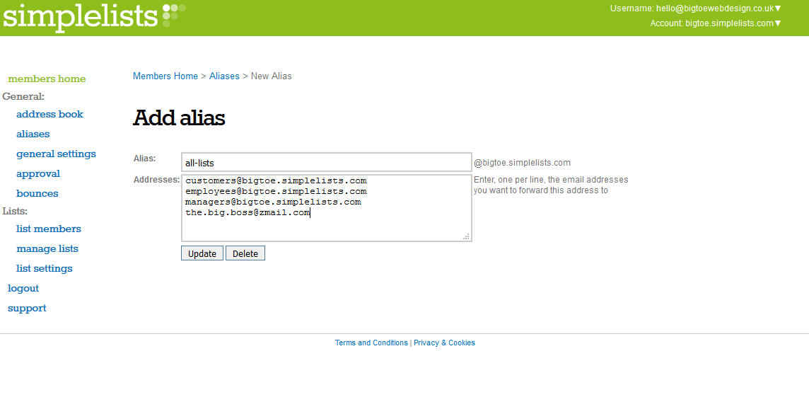 Choose an email address for the alias. Note that, by default, the email address ends in your simplelists domain. Enter the email address(es) of the lists you want the alias to be forwarded to. In the screenshot below, we have added three lists: customers, employees and managers. A normal email address is also included. Click 'Update’ to complete the process.